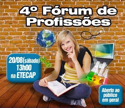 A ONG Grupo Primavera promove no sábado, 20 de agosto, a partir das 13 horas, o 4º Fórum de Profissões, a ser realizado na Escola Técnica Estadual Conselheiro Antonio Prado (Etecap), em Campinas. São esperados cerca de 1,5 mil jovens, que poderão se inscrever na hora, gratuitamente, para ouvir palestras sobre as diferentes profissões técnicas e a realidade do mercado de trabalho. Entre as profissões em alta, atualmente, estão as ligadas à informática, mecatrônica, petróleo e meio ambiente.