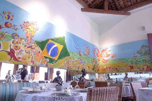 Na tela, de 12 metros por dois, baianas, o Cristo Redentor, Carmem Miranda e casarios dividem o espaço com os ingredientes da comida brasileira. Tudo com uma grande harmonia de cores que completam o ambiente aconchegante do restaurante.