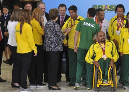 Em pé ao lado da delegação brasileira, Dilma deixou de lado discurso preparado para a cerimônia e falou de improviso. Por diversas vezes, ela se afastou do microfone para falar diretamente aos atletas. Dilma parabenizou os atletas pelo desempenho no campeonato mundial e ressaltou que os bons resultados servem de exemplo e orgulho para o país. “Cada brasileiro olha para vocês com carinho, admiração, respeito pelo comprometimento e desempenho. Vocês demonstraram que existem valores que devemos cultuar e cultivar: o empenho, a determinação, o trabalho árduo e a alegria de vencer.”