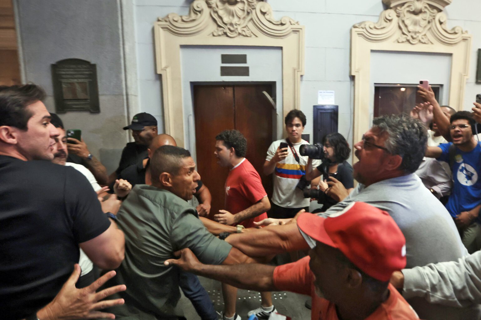 A situação se agravou no térreo do prédio, com a presença do vereador paulistano Rubinho Nunes e do vereador de Vinhedo Malcon Mazzucatto, ambos do União Brasil, acompanhados de assessores. Houve troca de socos, empurrões e discussões acaloradas, registradas em vídeos que circularam rapidamente nas redes sociais. As imagens mostram confronto físico direto entre políticos bolsonaristas e militantes, enquanto agentes de segurança acompanhavam a cena sem intervir de forma imediata.