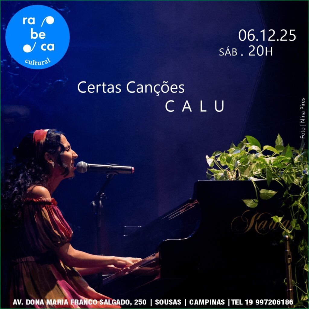 O Rabeca Cultural recebe neste sábado, 6 de dezembro, às 20h, o espetáculo musical “Certas Canções”, com a cantora, pianista e compositora Calu. Acompanhada por João Almeida (flauta), Tomi Medeiros (guitarra e violão), Eduardo Koji (contrabaixo acústico), Marcelo Choba (baixo elétrico) e Sakae (bateria), a apresentação tem duração aproximada de 50 minutos e mistura obras autorais e interpretações inspiradas na música “Certas Canções” de Milton Nascimento e Tunai.