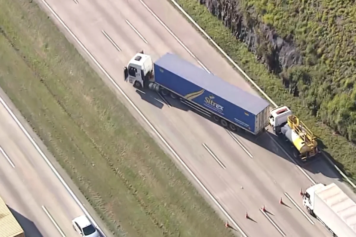 A ocorrência segue em andamento e, por medida de segurança, o tráfego permanece bloqueado até a conclusão da perícia e a retirada do caminhão. Foto Reprodução GloboPlay
