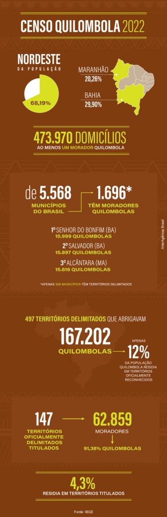 O Censo Demográfico 2022 mostrou que a população quilombola residente no Brasil é de 1.327.802 pessoas, correspondendo a 0,65% da população. Há 1.696 municípios com população quilombola e 473.970 domicílios particulares permanentes com moradores quilombolas. Dados da pesquisa Censo 2022 – Quilombolas: Primeiros Resultados foram divulgados nesta quinta-feira (27) pelo Instituto Brasileiro de Geografia e Estatística (IBGE).