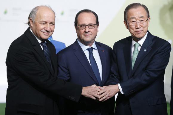 O ministro das Relações Exteriores francês, Laurent Fabius; o presidente da França, François Hollande e o secretário-geral da ONU, Ban Ki-Moon se cumprimentam na COP21