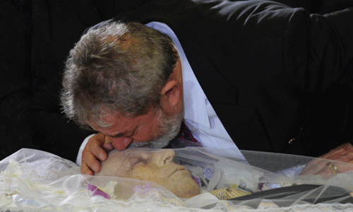 Ao chegar ao Salão Nobre do Palácio do Planalto, acompanhando a presidenta Dilma Rousseff, Lula prestou condolências a Josué da Silva, filho de Alencar, e dona Mariza Gomes da Silva, viúva do ex-vice presidente. Ao se aproximar do caixão, Lula não conteve as lágrimas e beijou a testa do seu companheiro dos últimos oito anos no comando do país.