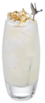 Agite e coe em um copo cheio de gelo. Cubra com água gaseificada e decore com flocos de ouro comestíveis.