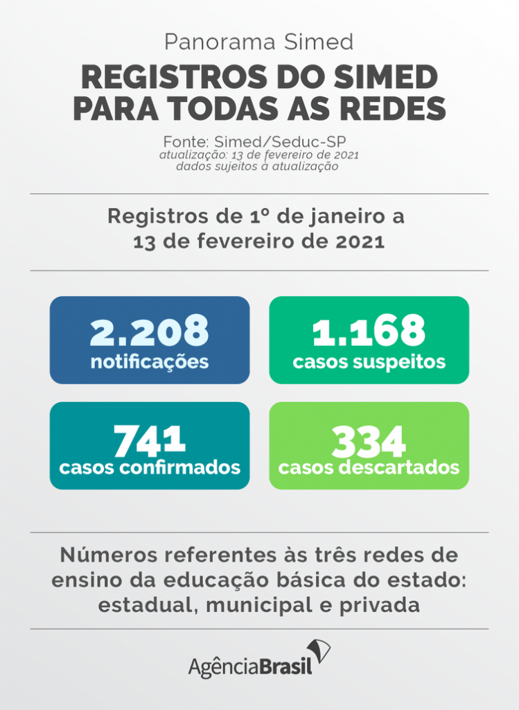 Do dia 1º de janeiro a 13 de fevereiro, segundo levantamento feito pela Secretaria Estadual da Educação, o estado registrou 2.208 notificações de covid-19 nas escolas, com 741 casos confirmados, 334 descartados e, o restante, casos suspeitos, ainda em análise.