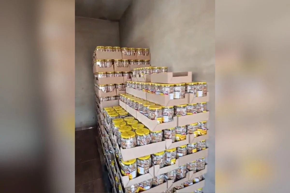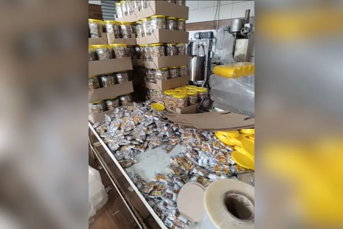 No interior do imóvel, os policiais identificaram uma estrutura industrial montada para a fabricação e o envase de doces. Aproximadamente 3 mil embalagens prontas para comercialização foram apreendidas, além de cerca de 10 mil embalagens vazias que seriam utilizadas na produção. Segundo relato do proprietário, a produção semanal variava entre duas e quatro mil unidades, o que representa cerca de três toneladas de doces por semana.