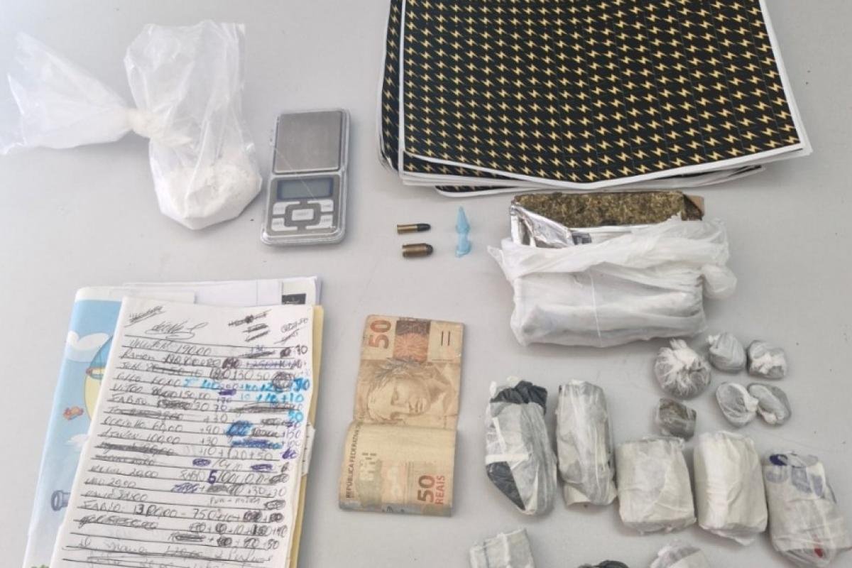 Ao chegar ao endereço indicado, os policiais abordaram um usuário que saía do local e que confirmou ter acabado de comprar drogas. Em seguida, a equipe entrou no imóvel e deteve o responsável pela venda dos entorpecentes. Durante a vistoria, foram apreendidos 409 gramas de maconha, entre meio tijolo e porções fracionadas, 45 gramas de cocaína, duas munições intactas — uma de calibre .380 e outra de calibre .22 — além de R$ 50 em dinheiro e anotações relacionadas ao tráfico.