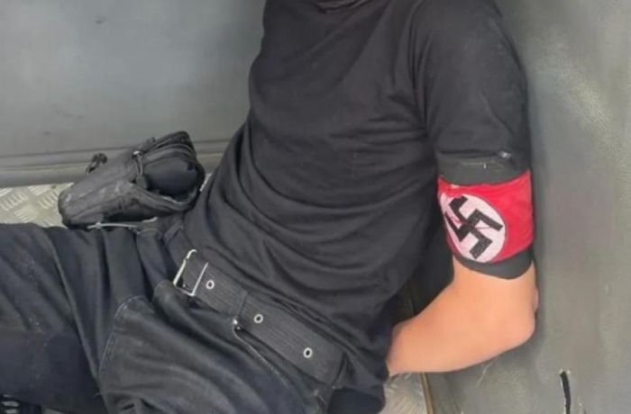 A polícia aprendeu garrafas amarradas e cheias de combustível e pregos, carta com suástica e réplica de fuzil, além da machadinha.