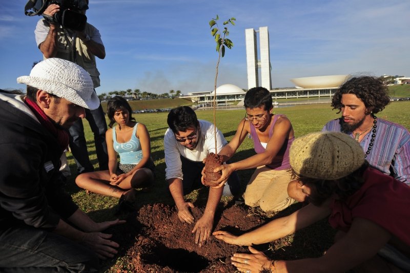 Jovens reuniram-se no dia 2 em frente ao Congresso Nacional para protestar contra a aprovação do novo Código Florestal e contra a construção da Usina Hidrelétrica de Belo Monte. Os manifestantes estão acampados em Brasília desde domingo (31) e têm o objetivo de plantar mudas de árvores nativas do cerrado, no gramado em frente ao Congresso.