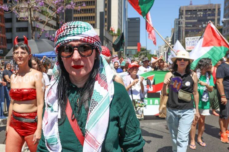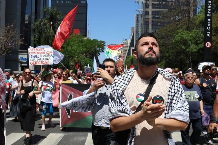 O protesto, marcado por bandeiras palestinas, cartazes e palavras de ordem, reuniu representantes de partidos políticos, sindicatos, organizações estudantis e brasileiros de origem árabe. A concentração começou no fim da manhã e seguiu em caminhada até a Praça Roosevelt, no centro da capital.
