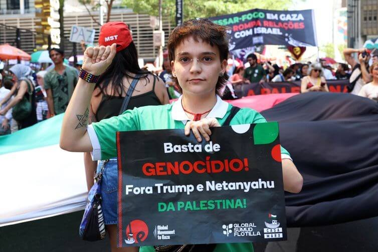 SÃO PAULO — Em mais um ato pró-Palestina realizado neste domingo (5) no centro de São Paulo, alguns milhares de manifestantes tomaram a Avenida Paulista para denunciar a ação da marinha israelense contra a Flotilha Global Sumud e exigir a libertação dos ativistas detidos, entre eles 11 brasileiros. O grupo também cobrou que o governo Lula rompa relações diplomáticas e comerciais com Israel.