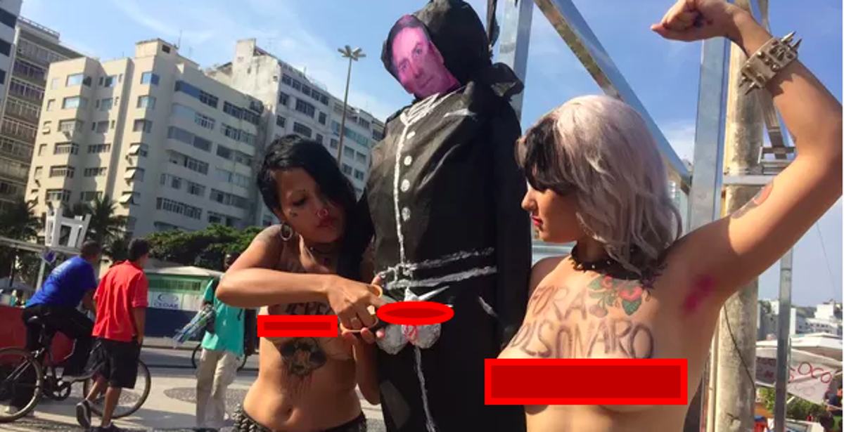 Ativista do Femen, Sara Winter (a direita na foto) em protesto a ‘Fora Bolsonaro! Agora, funcionária da ministra Damares e organizadora do acampamento dos 300