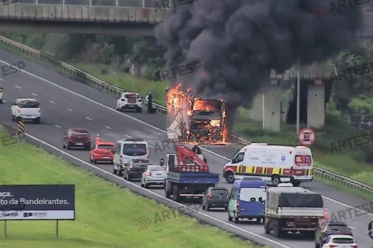Um ônibus teve o interior tomado por chamas na pista sul da Rodovia dos Bandeirantes (SP-348), na altura do km 92, em Campinas, na manhã desta quarta-feira (10). O registro da concessionária responsável ocorreu às 6h09, levando à interdição parcial das faixas 2, 3 e do acostamento.