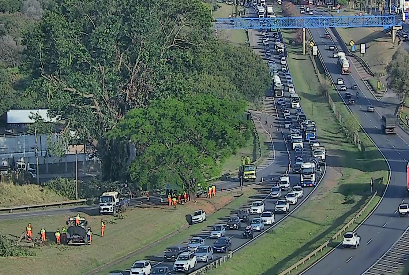Corte emergencial de árvore interdita acesso a Paulínia pelo km 121 da rodovia Prof. Zeferino Vaz (SP-332)