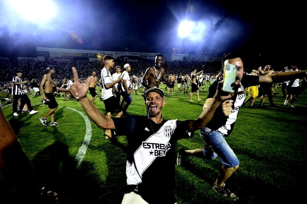O apito final do árbitro Felipe Lima deu início a uma festa inesquecível. Centenas de torcedores correram para o campo, abraçaram jogadores, subiram nas traves e recolheram pedaços de rede e bandeiras como lembranças do momento histórico. Até o carromaca, equipamento de socorro usado em campo, virou veículo de desfile improvisado para os torcedores em êxtase.