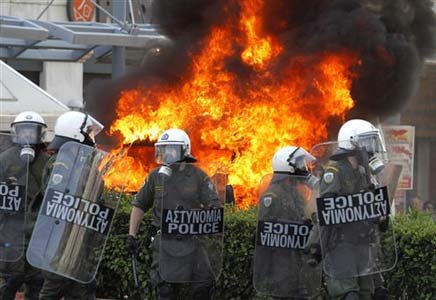 Dois prédios públicos, uma agência da receita e um edifício da prefeitura de Atenas, também foram incendiados com coquetéis molotov.