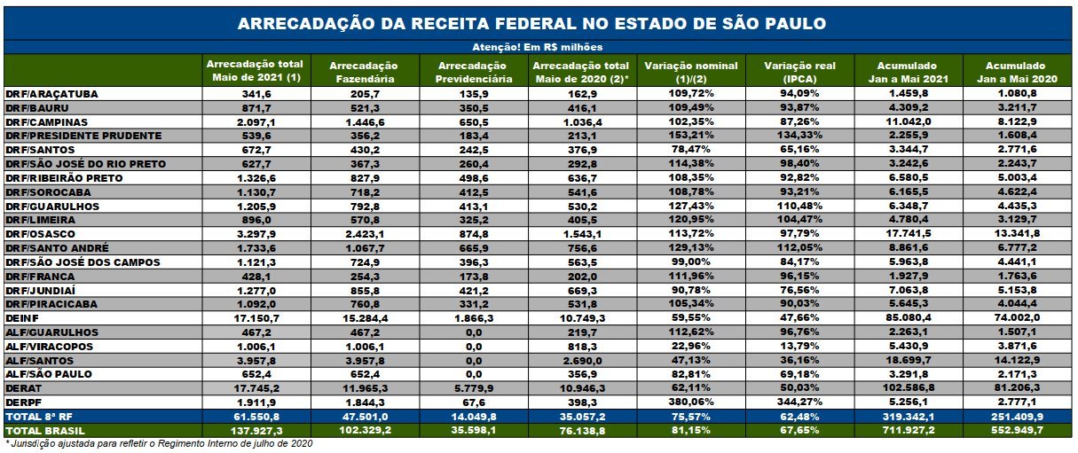 A arrecadação, no estado de São Paulo, das receitas administradas pela Receita Federal atingiu, em maio de 2021, o valor de R$ 61,55 bilhões, registrando acréscimo real (IPCA) de 62,48% em relação a maio de 2020, quando foram arrecadados R$ 35,06 bilhões no estado.