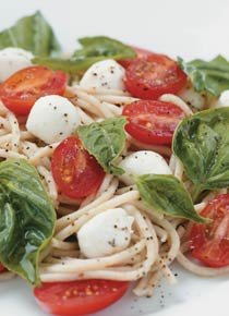 Cozinhe o espaguete al dente e espere esfriar. Coloque num prato e acrescente o tomate, a mussarela de búfala e o manjericão. Tempere com molho básico ou italiano.