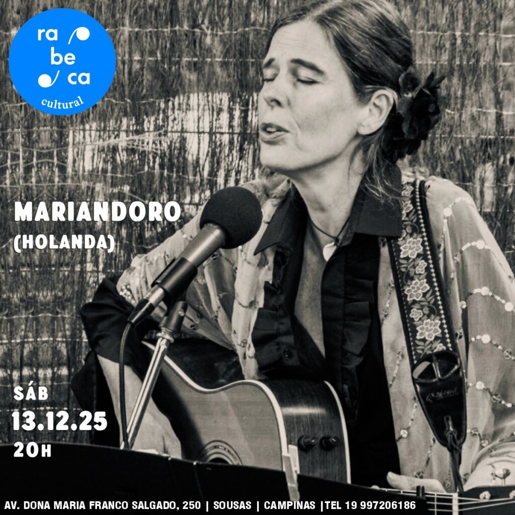 A Rabeca Cultural recebe no sábado (13), às 20h, a cantora, violonista e compositora holandesa Mariandoro, em uma apresentação que promete percorrer tradições musicais de vários continentes. Com voz de textura cálida e violão de forte assinatura pessoal, a artista cria uma sonoridade marcada pela fusão entre fado, bossa nova, chanson francesa, folclore argentino e referências de nomes como John Denver, Kate Wolf, Don McLean e Joni Mitchell.