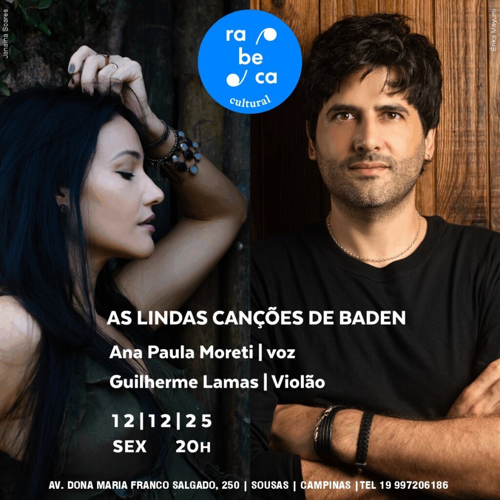 A Rabeca Cultural promove no dia 12 de dezembro, às 20h, o espetáculo “As lindas canções de Baden”, dedicado à obra de Baden Powell. A apresentação reúne a cantora Ana Paula Moreti e o violonista de sete cordas Guilherme Lamas, reconhecidos por trabalhos ligados ao repertório brasileiro de matriz afro-samba e ao legado do violão popular.