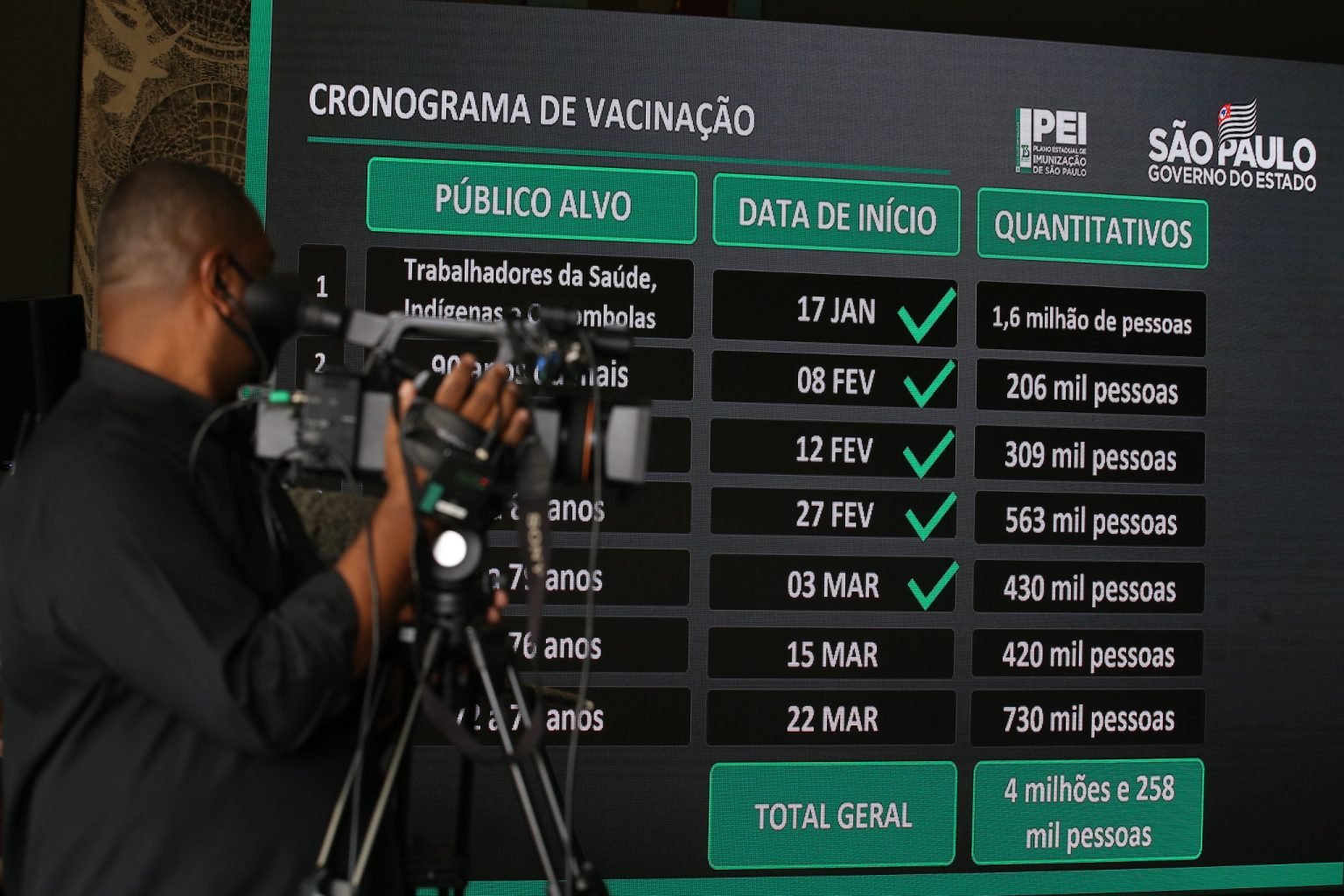 “Lembro que começaremos, em 15 de março, a vacinar as pessoas de 75 e 76 anos de idade. Uma semana depois, já iniciaremos a vacinação de pessoas com 72, 73 e 74 anos. Uma dádiva pra quem ainda tem seus pais, seus avós em vida é terem a oportunidade de prolongarem suas vidas com vacina”, disse Doria.