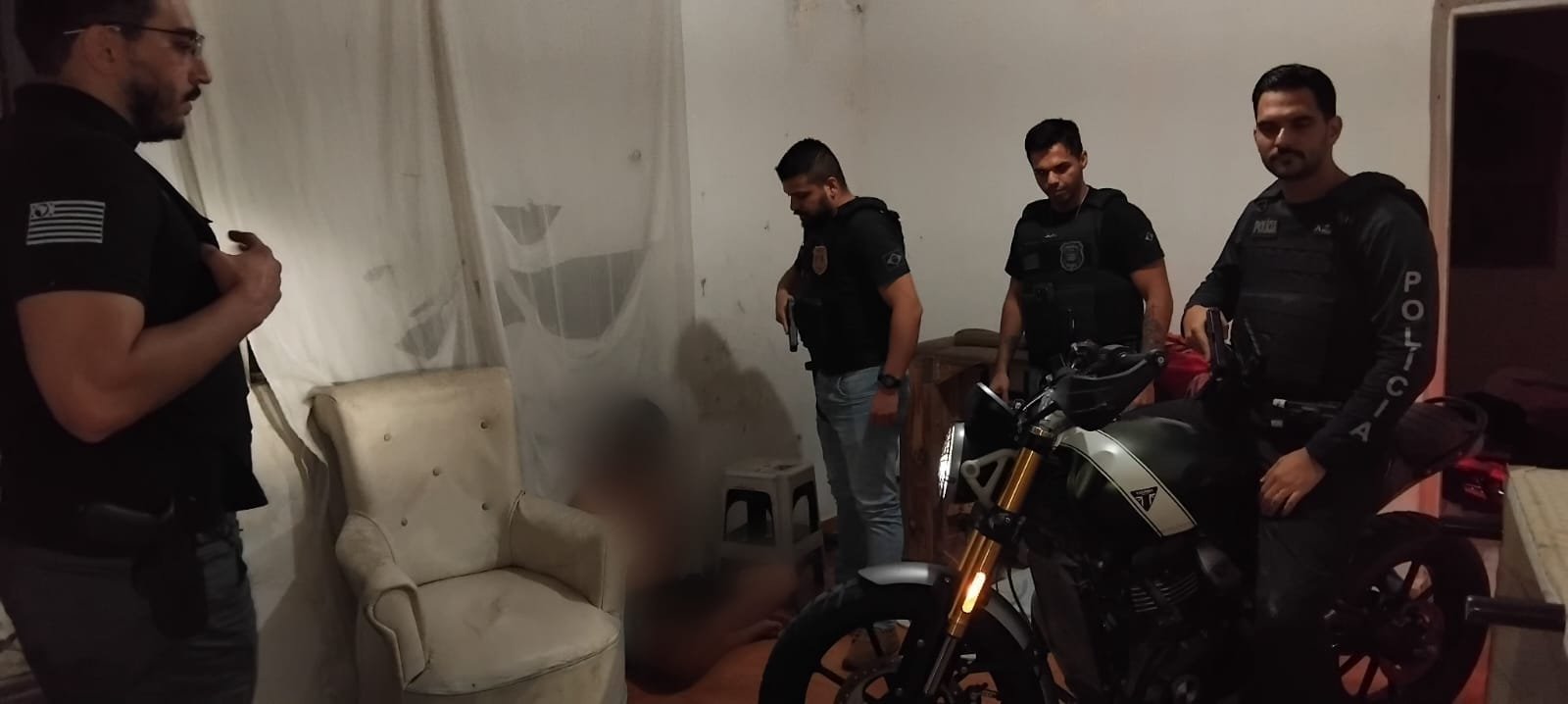 No imóvel, os policiais apreenderam uma arma de fogo com munições, um celular e uma motocicleta sem placa e com numeração suprimida. Foto Divulgação Polícia Civil