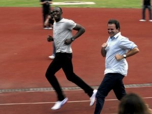 Bolt e Paes chegaram de helicóptero e foram recepcionados por dezenas de jovens, a maioria alunos da vila olímpica. Na pista de atletismo, os dois simularam uma corrida, logicamente vencida pelo jamaicano.