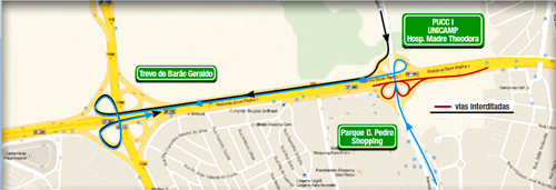 Situação 3: O motorista que se encontra no Parque das Universidades/PUC/hospital Madre Theodora e desce a avenida Guilherme Campos a fim de acessar a pista sentido Jacareí da D. Pedro I não poderá utilizar a alça que dá este acesso no trevo do shopping. A alternativa é acessar a D. Pedro I no sentido Anhanguera e realizar o retorno no Trevo de Barão Geraldo, a 1 km.